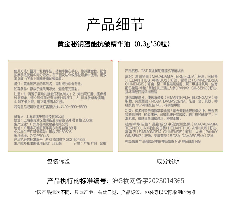 TST黄金秘钥蕴能抗皱精华油(0.3g*30粒)*2 赠送:TST黄金秘钥蕴能抗皱精华液10ml*2+脸基尼+TST活酵母虾青素抗皱修护面膜乳三联包*2